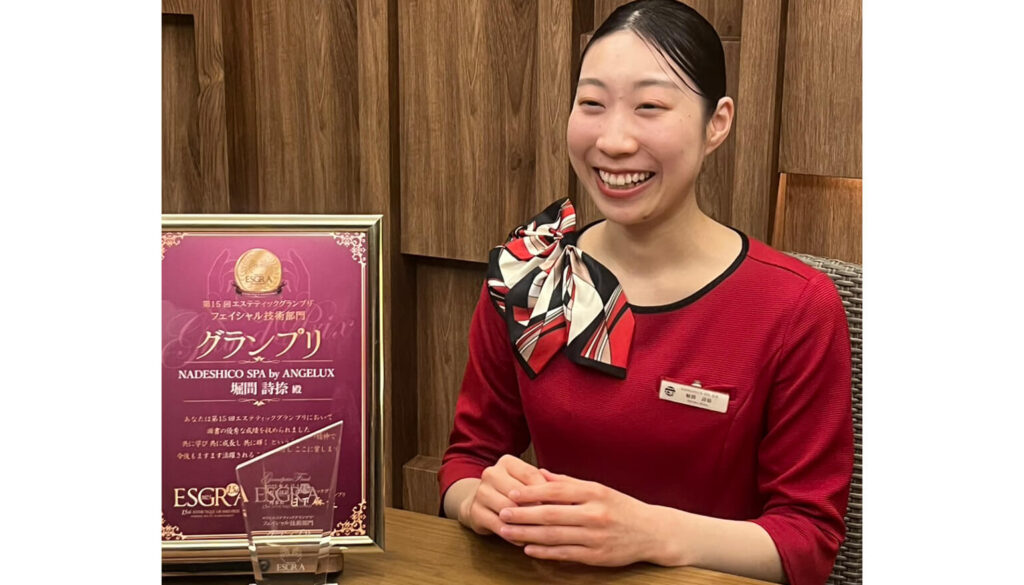 第15回エステティックグランプリ、フェイシャル技術部門で見事グラプリを受賞した、NADESHICO SPA by ANGELUX 堀間詩捺さん。オンラインテスト、エリアファイナル、グランプリファイナルを勝ち抜き、フランス・パリで行われる世界大会に出場されます。その取り組みと背景、そして想いを伺います。